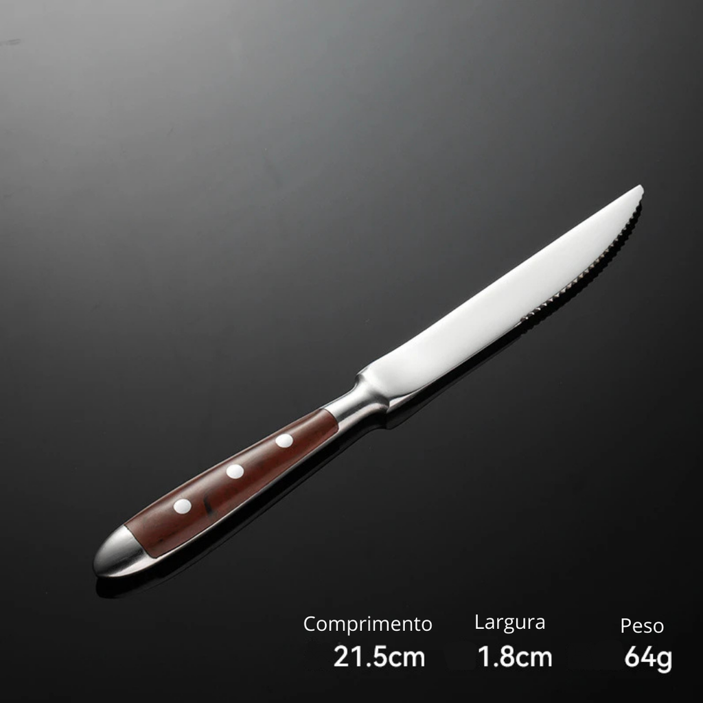 Fabricado em aço inoxidável 430 de alta qualidade e madeira de baquelite ecológica, o conjunto garante longa vida útil, resistência à corrosão e respeito ao meio ambiente.