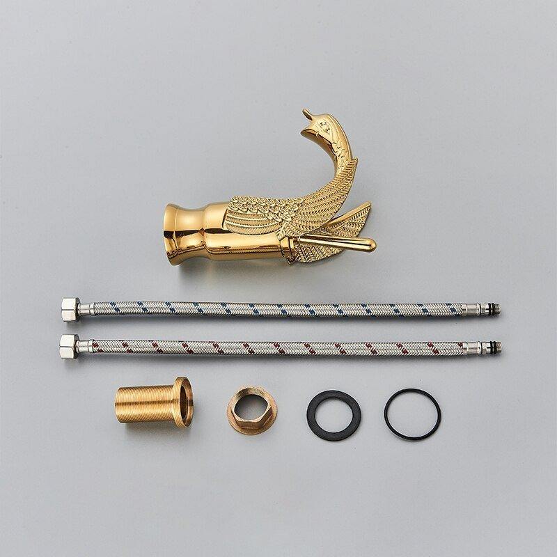 - Conteúdo da Embalagem: 1 Torneira Cisne Dourada, 2 Mangueiras de Aço Flexível, 2 Borrachas de Vedação, 2 Roscas de Suporte